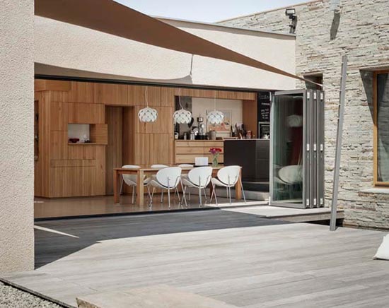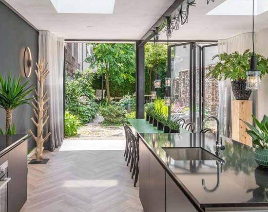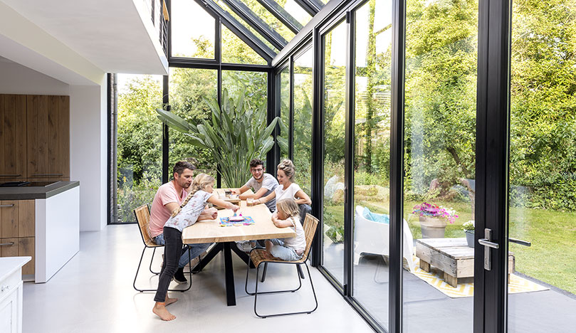Een wand voor ruim zicht. Beschut en toch buiten. Slecht één smal kozijn van buiten verwijderd. Voor een bijzonder woongevoel.